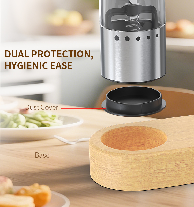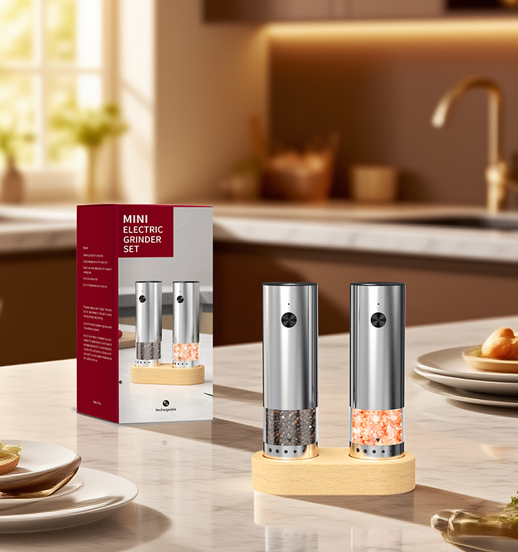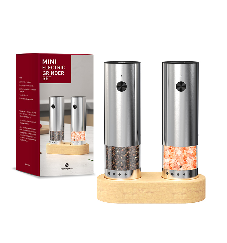 2025 Latest KYMQ-82A-BS Mini Rechargeable Salt and Pepper Mill 2 pcs with a Wooden Base External Coarseness Adjustment Popular in Korea and Japan Pepper Grinder Factory And Manufacturer