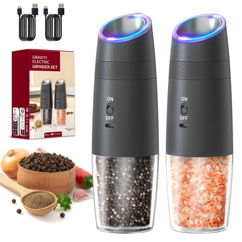 1. Convenient external Adjuster2. Gift set with 2 grinders, one for pepper, one for salt3. Gravity activated, just simply turn upside down and get fresh ground salt or pepper4. The LED light will turn on automatically when the grinder is in operation5. The ceramic grinder is on the top to keep your table or countertop free of residue.6. Large capacity of powder container (135ml), the remaining amount of pepper/salt is visible7. Good texture of surface with matt finish8. Powered by lithium battery that is easy to charge with Type C cable9. The light on the top will turn on automatically when charging