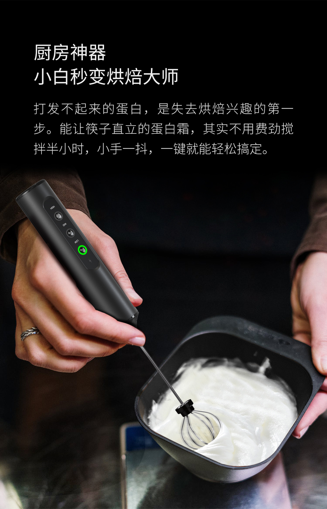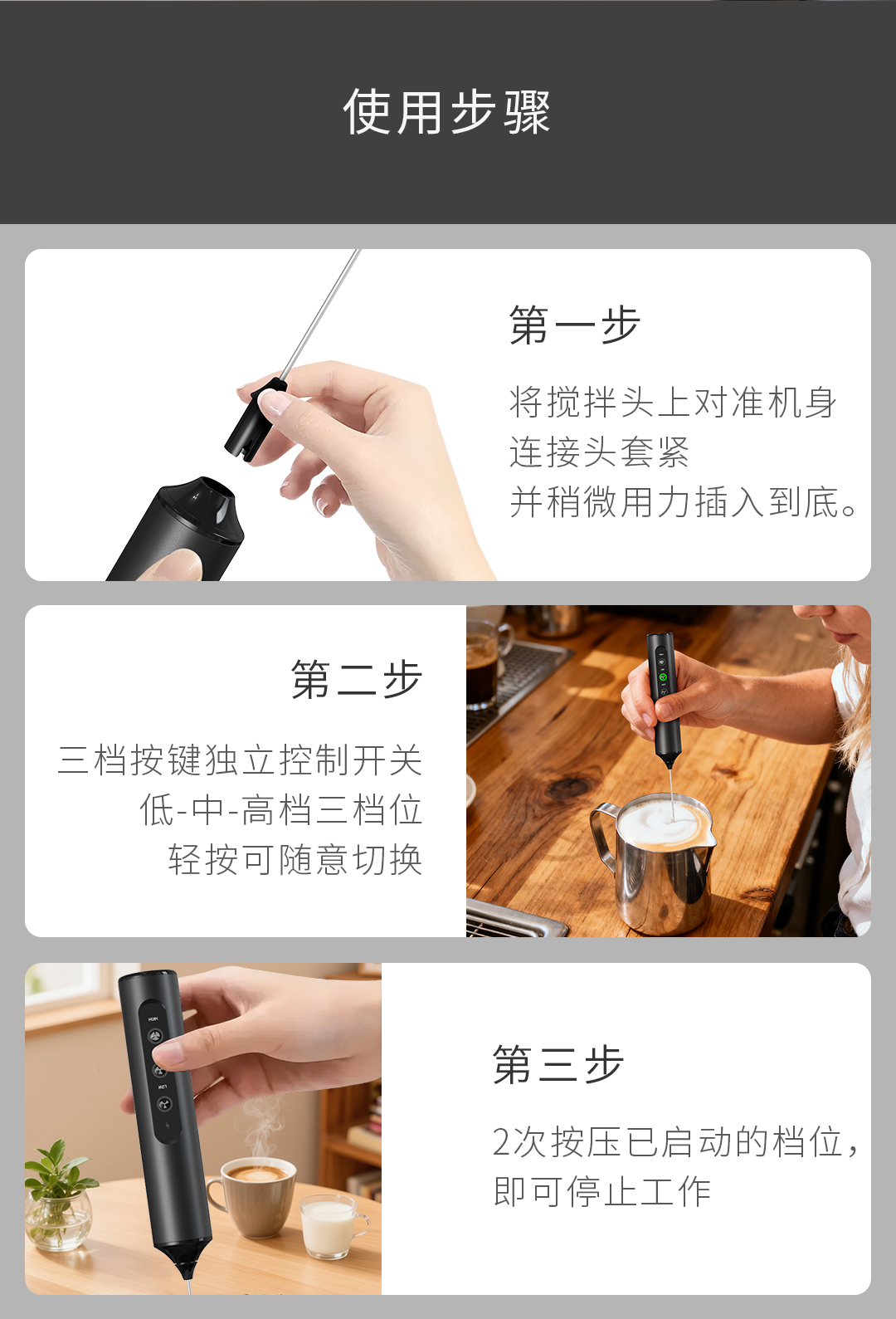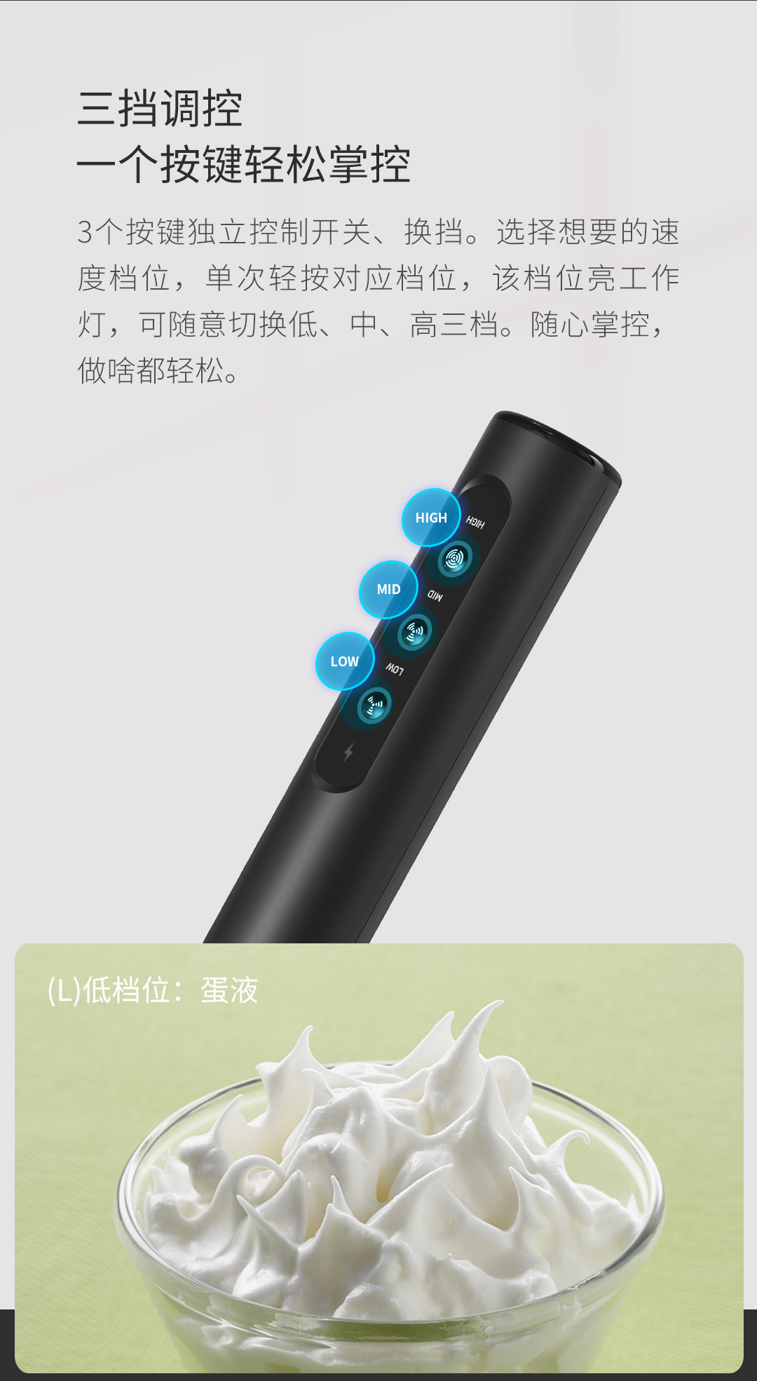It features 3 adjustable speed levels, controlled by independent buttons, ensuring easy operation With 3 types of mixing heads, meeting the needs of making different kinds of food Powered by a built-in rechargeable lithium battery, no need to replace the battery, which is environmentally friendly and saves money. Equipped with a TYPE C charging cable and a charging port for you to charge on any USB interface. Made of food-safe materials Double-layer of milk frother whisk Include: KJBQ-23X Electric Milk Frother, Egg Whisk, Hook Stirrer, Stand, Charging Cable, Manual, Color Box Rated Power: 10W Input Power: 5W Materials: Stainless Steel, ABS Product Size: φ32x280mm N.W: TBC G.W: TBC Package Type: Color Box Package Size: TBC
